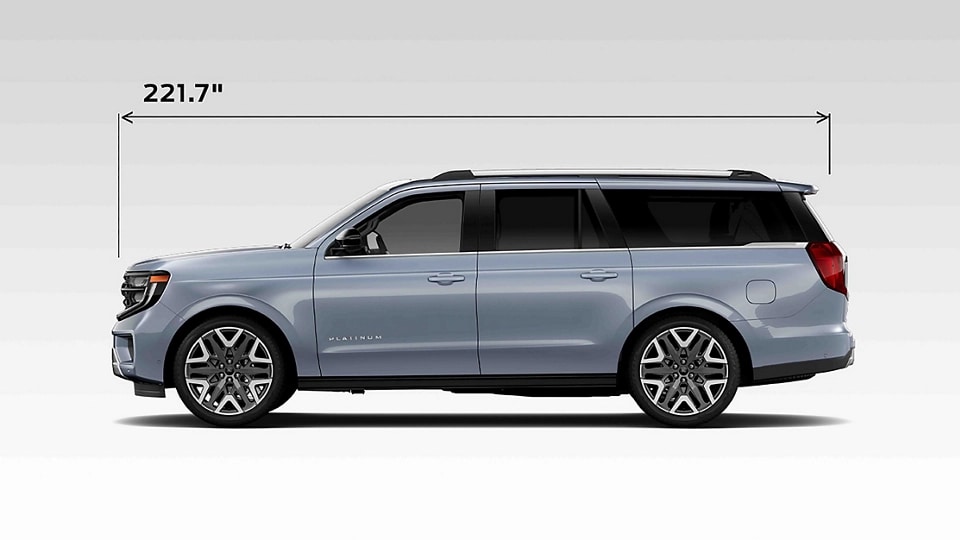 Exterior dimensions are 221.7" long and 84.6" wide with the sideview mirrors folded (94.6" wide with the sideview mirrors).